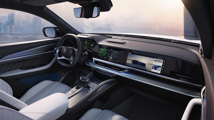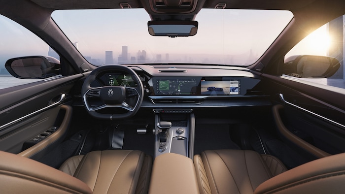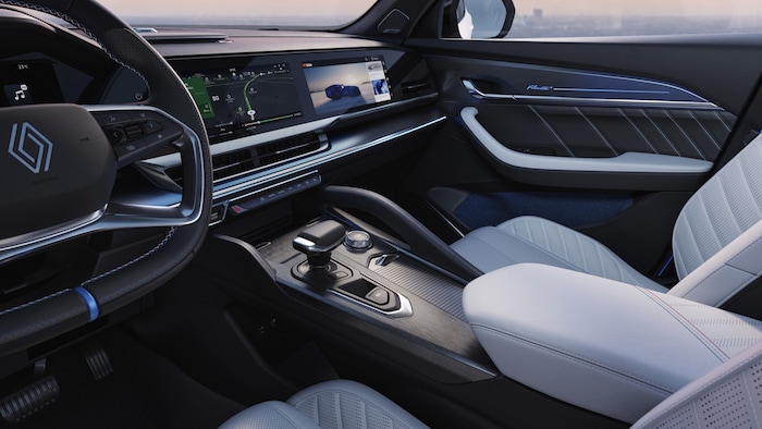 Im Innenraum setzt Renault auf ein stark digitalisiertes Cockpit. Drei je 12,3 Zoll große Displays bilden eine durchgehende Bildschirmlandschaft, ergänzt durch ein riesiges Head-up-Display. Dank mehr als 2,80 Meter Radstand haben die hinteren Passagiere sehr viel Beinfreiheit. Und 654, bei umgelegter Bank sogar über 2000 Liter Kofferraumvolumen genügen auch für großes Gepäck. So tritt der Filante als Reise- und Familienfahrzeug auf, aber auch als gehobene Business-Limousine, in der man sich gerne chauffieren lässt. Komfortmerkmale wie Dreizonen Klimaautomatik, ein 1,1 Quadratmeter großes Glasdach und ein aufwendiges Akustikpaket sollen den Premiumanspruch unterstreichen.