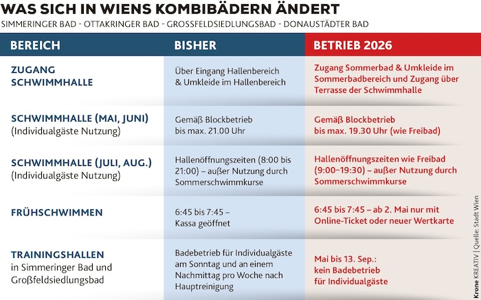 Die „Krone“ weiß, was alles im Entstehen ist: „Der Neubau der Schwimmhalle im Höpflerbad und die Erneuerung des Daches im Döblinger Bad wurden bereits gestartet und werden planmäßig fortgesetzt“, heißt es von der Stadt. „Die Erneuerung des Daches im Kombibad Hietzing folgt ab Ende April, die umfassende Sanierung des Jörgerbades im Juli. Hierfür bleibt heuer das angeschlossene Freibad geschlossen.“