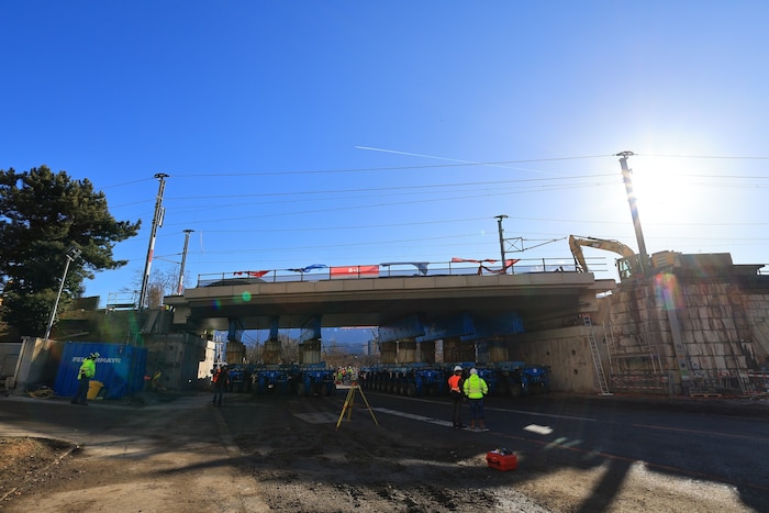 Dabei haben die Techniker 112 Räderpaare einzeln gesteuert. Nach einer Drehung um rund 90 Grad hat die Brücke millimetergenau ihre Position auf den Widerlagern gefunden. Das Vorhaben gelang bravourös und fand vor den Augen von Dutzenden Zuschauern statt.