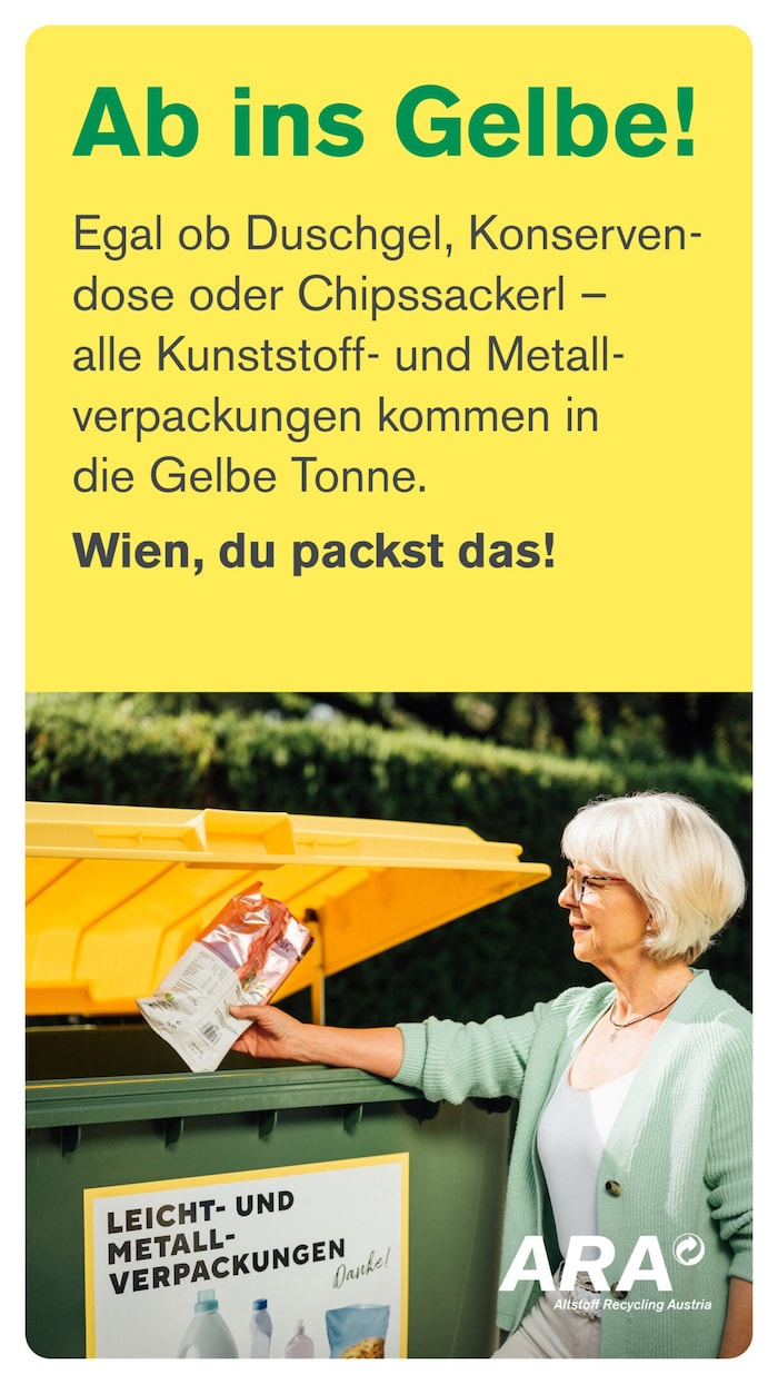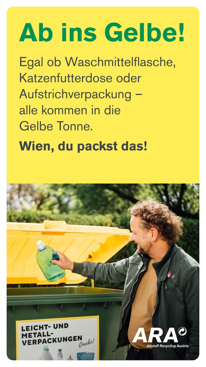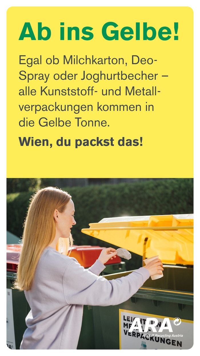 Mit den gesammelten Verpackungen geht es dann zur nächsten Sammelinsel. Diese ist meist nur wenige Meter von deinem Wohnort entfernt – der digitale Wien-Stadtplan erleichtert die Suche nach dem nächstgelegenen Sammelpunkt. Und mit der Gelben Tonne direkt vor der Haustür wird Sammeln und Trennen gleich noch viel bequemer.