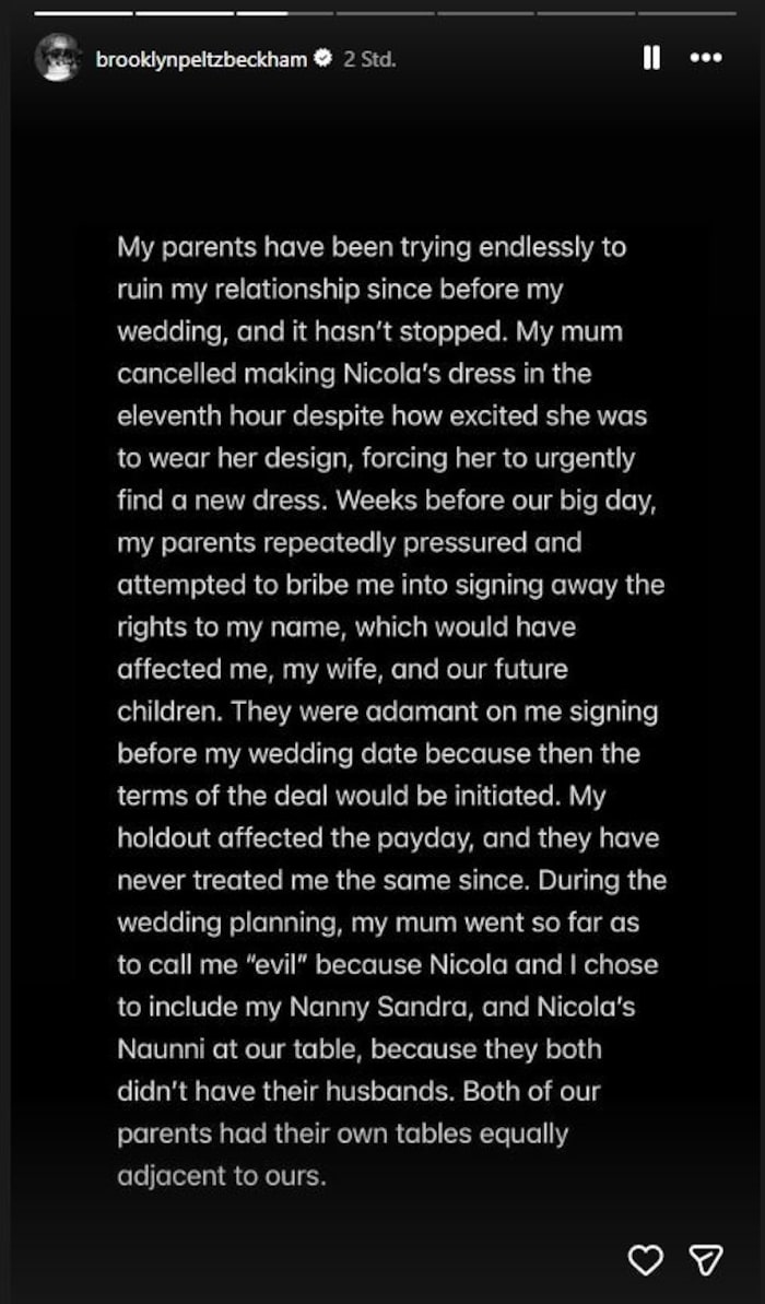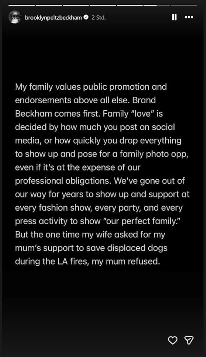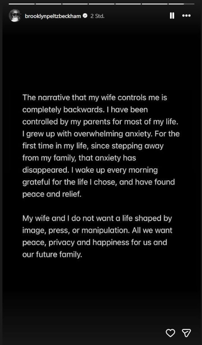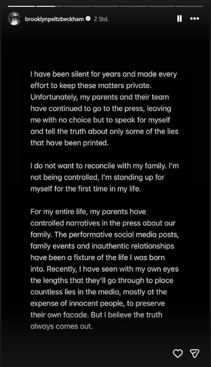 „Ich will mich nicht mit meiner Familie versöhnen. Ich werde nicht kontrolliert, sondern stehe zum ersten Mal in meinem Leben für mich selbst ein.“ Seinen Eltern wirft er vor, Kontrollfreaks zu sein, die ihn „große Teile“ seines Lebens unterdrückt hätten. „Mein ganzes Leben lang haben meine Eltern die Darstellung unserer Familie in der Presse kontrolliert. Die inszenierten Social-Media-Posts, Familienfeste und unechten Beziehungen waren fester Bestandteil meines Lebens“, so der Vorwurf von Brooklyn Beckham.