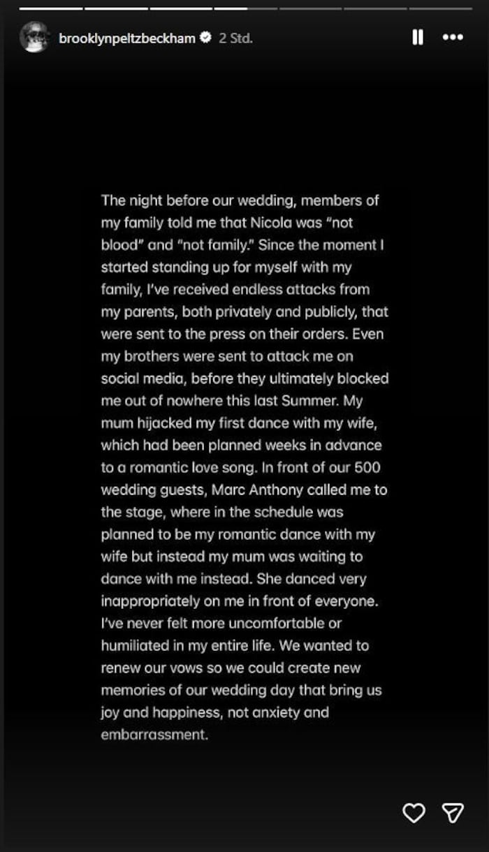 An seinem Hochzeitstag sei es zu einer Reihe von Demütigungen gekommen. Darunter Momente, in denen Familienmitglieder Nicola öffentlich abwerteten. Der Hochzeitstanz wurde zum Albtraum: „Vor unseren 500 Hochzeitsgästen rief mich Marc Anthony auf die Bühne. Dort sollte eigentlich mein romantischer Tanz mit meiner Frau stattfinden, doch stattdessen wartete meine Mutter darauf, mit mir zu tanzen. Sie tanzte völlig unpassend vor allen Anwesenden auf mir herum.“ Für Brooklyn offenbar ein Albtraum. „Ich habe mich in meinem ganzen Leben noch nie so unwohl und gedemütigt gefühlt.“
