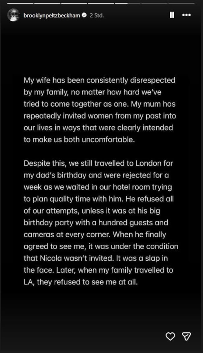 Auch jetzt würden seine Eltern versuchen, seine Beziehung systematisch zu zerstören: „Und es hört einfach nicht auf.“ Sogar seine Brüder seien von seinen Eltern auf ihn gehetzt worden. Besonders schwer wiegt sein Vorwurf, David und Victoria Beckham würden gezielt falsche Informationen streuen: „Ich habe in letzter Zeit mit eigenen Augen gesehen, wie weit sie gehen, um unzählige Lügen in den Medien zu verbreiten, meist auf Kosten unschuldiger Menschen, um ihre eigene Fassade zu wahren. Aber ich glaube, die Wahrheit kommt immer ans Licht.“