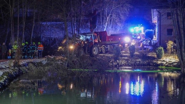 Der Anhänger kam im Böschungsbereich zwischen Straße und Teich zum Stillstand. Der Lenker des Traktors konnte sich offenbar unverletzt retten. Die Bergung des verunfallten Fahrzeuggespanns gestaltete sich schwierig. Mit zwei Kränen wurde der verunfallte Traktor dann aus dem Teich gehoben und auf einen Tieflader verladen.