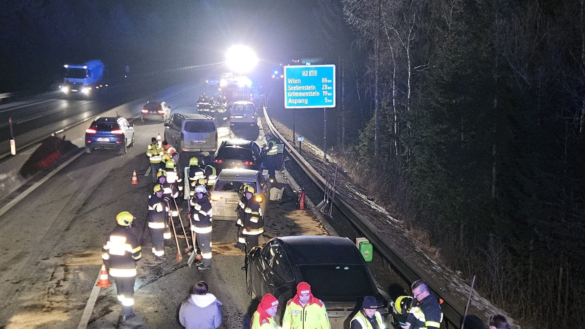 Chaotische Szenen spielten sich aufgrund der Glatteis-Situation am Dienstagabend auf der Südautobahn in Fahrtrichtung Wien ab. Insgesamt kollidierten sieben Fahrzeuge – verletzt wurde zum Glück niemand.