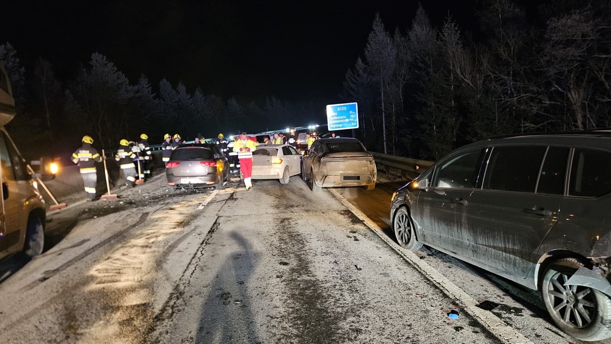Das erste Mal krachte es gegen 17.30 Uhr: Ein 21-Jähriger geriet mit seinem Pkw auf der glatten Fahrbahn ins Schleudern. Er prallte gegen das vor ihm abbremsende Fahrzeug eines 59-Jährigen. Beide Lenker brachten ihre Fahrzeuge am Pannenstreifen zum Stillstand. Eine nachkommende 34-jährige Autofahrerin hielt ebenfalls am Pannenstreifen an, um Erste Hilfe zu leisten.