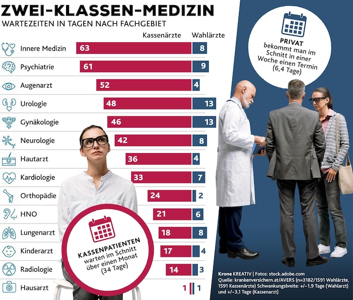 According to an analysis by krankenversichern.at (based on 1,591 mystery appointment requests between November 25, 2025, and January 16, 2026), there is a huge gap between private and public health insurance doctors in terms of waiting times. The difference is particularly drastic in the most sought-after disciplines: while public health insurance patients often wait for weeks, private availability is around two days in orthopedics, three days in radiology, and only four days in ophthalmology (see chart below).