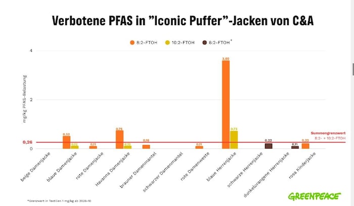 Von elf überprüften Jacken der Modekette C&A – sieben für Damen, drei für Herren und eine Jacke für Kinder – enthielten neun PFAS-Gifte. Bei drei Jacken lag die PFAS-Belastung deutlich über dem gültigen gesetzlichen Grenzwert. Ein Herrenmodell überschritt den Grenzwert sogar um das 16-fache. Diese Jacken dürfen in der EU gar nicht verkauft werden.