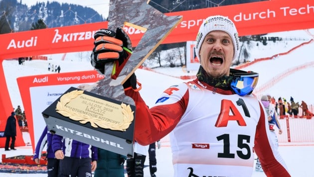 Endlich darf er das Objekt seiner größten Begierde in Händen halten. Von den Emotionen übermannt, streckte Manuel Feller die Goldene Gams für den Gewinn des Kitzbühel-Slaloms in den Himmel. „Jetzt könnte ich es lassen“, schmunzelte der Tiroler.
