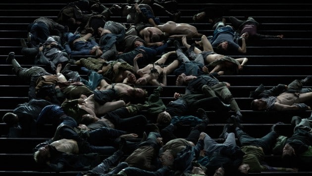 Wie die Verdammten des Jüngsten Gerichts stürzen und straucheln die 50 Männerkörper über die steile, dunkle Treppe, die die Bühne beherrscht. Es ist ein langsames, quälendes Abwärts in den Tod. Unaufhaltsam. Die todesmutigen Akteure steigen immer wieder (unsichtbar) die Treppe hinauf, um sie erneut herabzustürzen. Ein Perpetuum mobile des Sterbens.