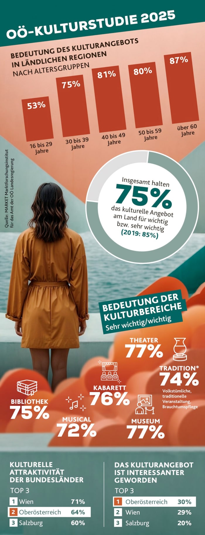 Das Market-Institut befragte 1000 Personen, die sowohl die Generationen als auch die Zusammensetzung der Bevölkerung repräsentieren. Das Erfreulichste: Bei der „kulturellen Attraktivität“ liegt Oberösterreich gleich hinter Wien auf Platz 2 im Bundesländerranking. Im knappen Überblick (siehe auch Grafik) halten 75 % das kulturelle Angebot im Land für wichtig bzw. sehr wichtig (2019 waren es 85%).