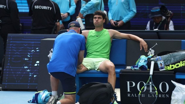 Krämpfe und Kreislaufprobleme machten Carlos Alcaraz im Halbfinale der Australian Open ordentlich zu schaffen. Wie der Spanier seiner Box im dritten Satz erklärte, habe er sich im Timeout sogar übergeben müssen.