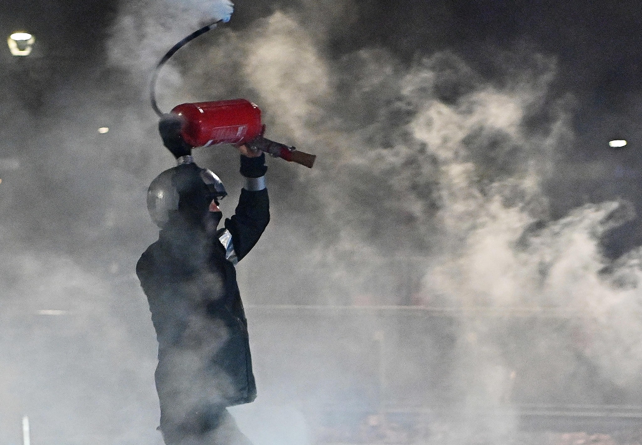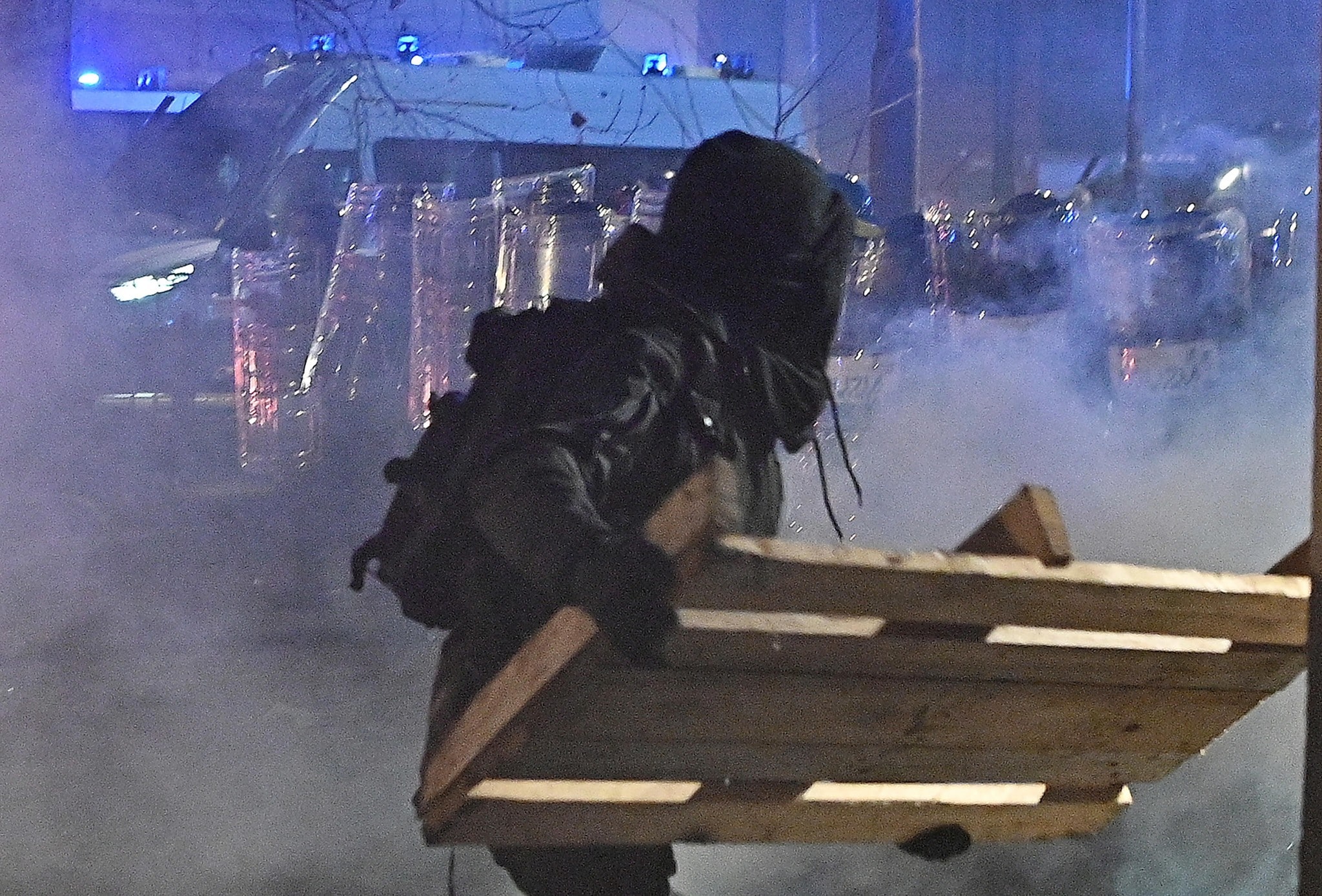 According to police, demonstrators threw stones, fireworks, Molotov cocktails, and other objects at the officers and erected barricades out of garbage containers and shopping carts. Several fires were set, including one on a police vehicle, which went up in flames. The officers used tear gas and water cannons.