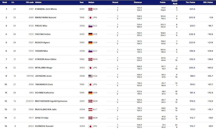 Die norwegische Skispringerin verwies nach Sprüngen auf 136 und 138,5 Meter die Japanerin Nozomi Maruyama um 7,9 Punkte auf Platz zwei.