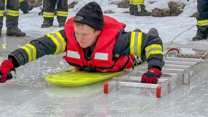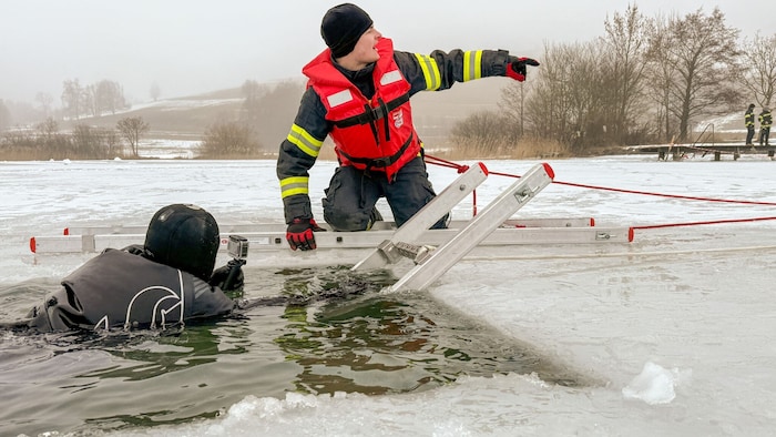 Die Einsatzkräfte wurden zunächst theoretisch in den Themenbereichen Eisrettung, Unterkühlung und Belastbarkeit der Eisfläche geschult. Noch bevor es zur Praxisübung auf den Irrsee ging, berichtete auch jener Polizist, der versucht hatte, die beiden eingebrochenen Frauen zu retten, von der tollkühnen Bergeaktion.