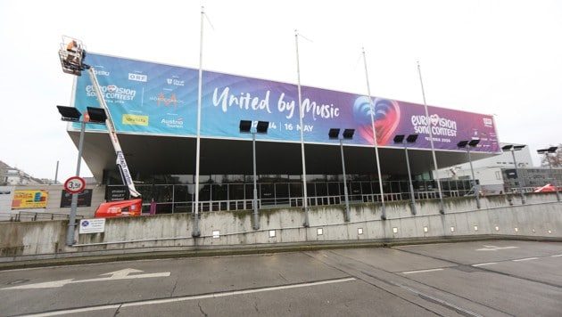 Am Donnerstagvormittag wurde ein großflächiges Plakat mit Logo des Song Contests auf das Vordach der Halle F angebracht.