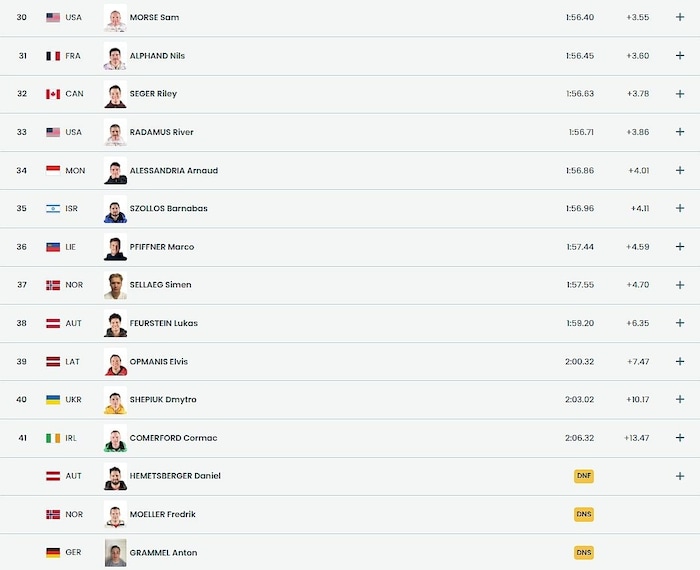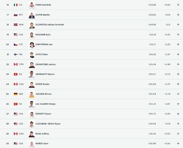 Behind Casse were two more Italians, Florian Schieder (+0.45 seconds) and Giovanni Franzoni (0.87). Stefan Babinsky (1.74), Vincent Kriechmayr (1.83), and Raphael Haaser (1.85) took places eleven to 13. Marco Odermatt (23rd) and Franjo von Allmen (26th) took an even more leisurely approach.