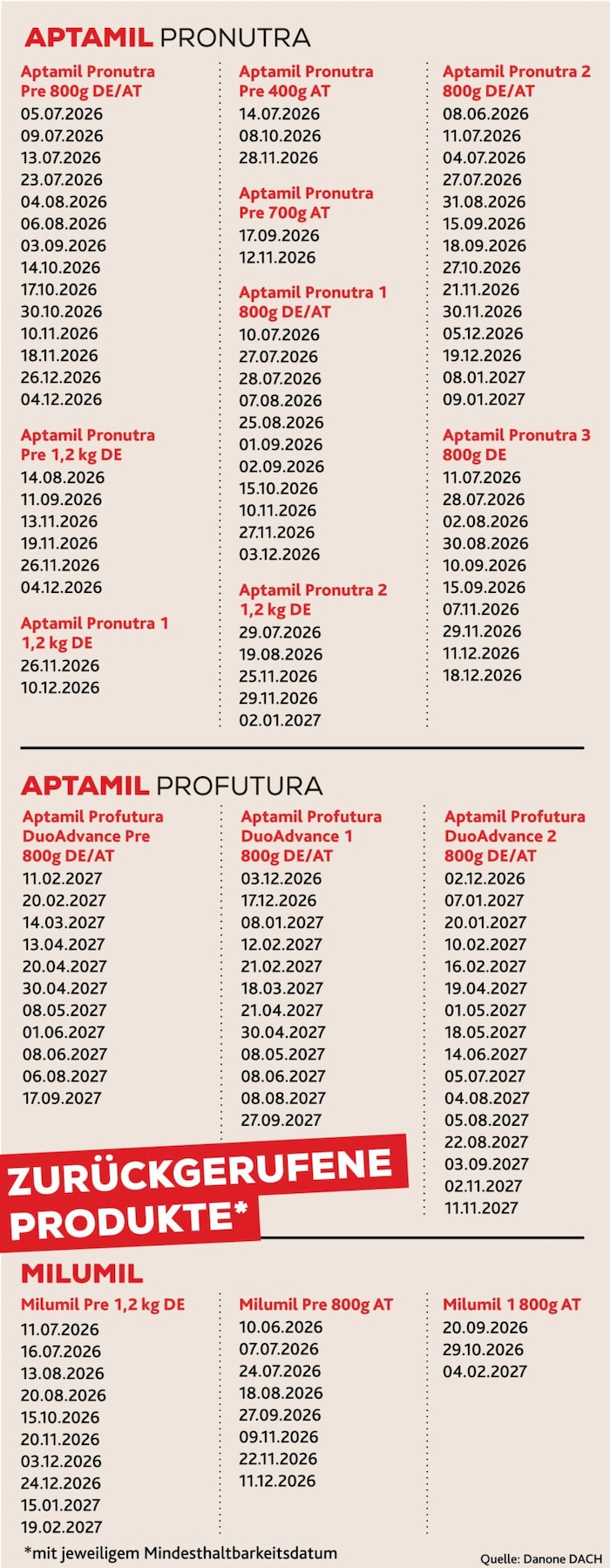Manufacturers have been asked to provide complete proof of safety before products can be re-released. "Spar is not affected by the recall; we did not have these products in our range," said the company spokeswoman. The discounter Hofer also did not carry any of the affected products. "Products affected by the recall that are available in our stores will of course be recalled immediately and removed from sale," the REWE Group said in response to an inquiry from "Krone." As soon as Danone's statement is available, it will be added.