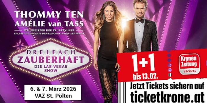 (Die Aktion ist ausschließlich gültig für die Veranstaltungstermine am 6. und 7. März im VAZ St. Pölten. Begrenztes Ticketkontingent. Buchbar bis 13.2.2026 und nur solange der Vorrat reicht. Maximal 4 Tickets (2+2) pro Kauf – alle Informationen finden Sie im Krone Ticketshop unter ticket.krone.at)