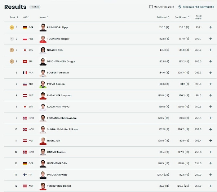Gold went to Germany's Philipp Raimund, who is still without a World Cup victory, who won by 3.4 points ahead of Poland's sensation Kacper Tomasiak. Bronze went to Japan's Ren Nikaido and Switzerland's Gregor Deschwanden, who were tied on 8.1 points.