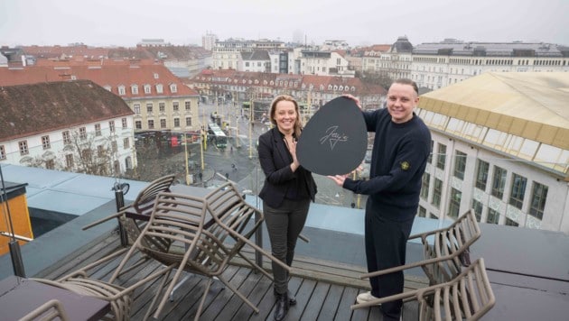 Noch ist’s eine Baustelle, aber schon bald soll man hier im fünften Stock des Grazer Steirerhofs mit prächtigem Ausblick genießen können. Ende März eröffnet das Mutter-Sohn-Gespann Manuela und Joachim Forstner das Jay’s. Offiziell wird das Lokal Jay’s The Rooftop Eat & Drink heißen. „Wenn man schon so eine Terrasse zur Verfügung hat, darf man sie schon auch in den Namen nehmen“, lächelt Küchenchef und Betriebsleiter Joachim. Hoch über dem Jakominiplatz will man künftig (fast) alles anbieten – vom Steak bis zum Burger und der hausgemachten Pasta.
