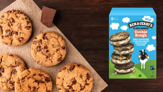 Ben & Jerry’s hat die Eissaison heuer früh eröffnet: Seit Februar ist das neue Cookie Dough Sandwich in österreichischen Supermärkten zu finden. Das Produkt kombiniert Vanilleeis mit Cookie‑Dough-Stückchen, eingebettet zwischen zwei marmorierten Kakao‑ und Vanillekeksen.