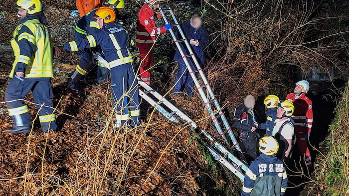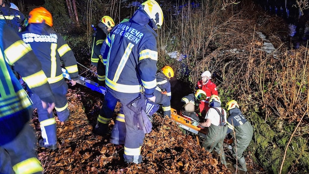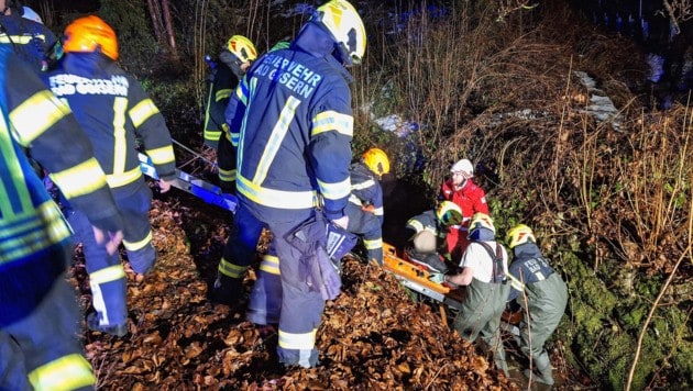 Einsatzkräfte der Feuerwehr und des Roten Kreuzes waren rasch vor Ort. Ihnen gelang es, den verletzten und unterkühlten 62-Jährigen schonend mit einer Schleifkorbtrage aus dem Bach zu retten.