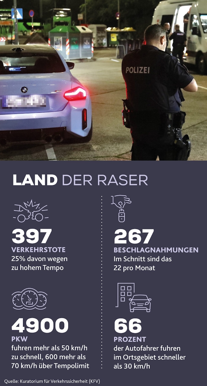 Als „Bundesland der Raser“ liegt Niederösterreich mit 109 Beschlagnahmungen einsam an der Spitze, weit abgeschlagen folgen Tirol (69), Wien (68) und Oberösterreich (44). Das kleine Vorarlberg beschlagnahmte bisher gesamt auch schon 43 Autos.