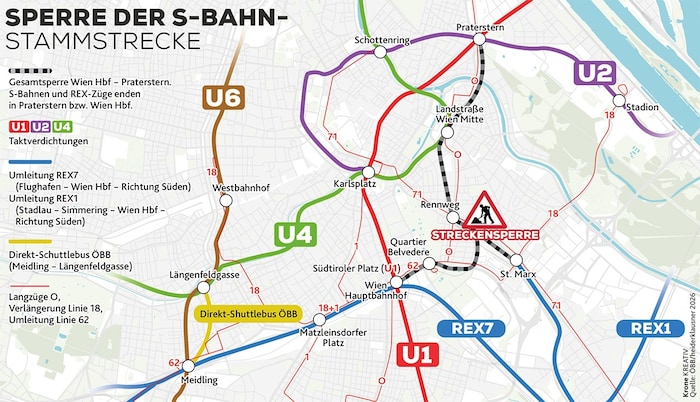 Es sind wohl ohne Übertreibung Bauarbeiten, die Wien in dieser Form noch nie gesehen hat: gleich 14 Monate am Stück muss die Stammstrecke der Schnellbahn gesperrt werden. Ab 7. September 2026 geht zwischen dem Hauptbahnhof und Praterstern gar nichts mehr.