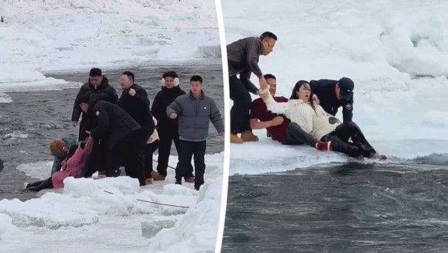 Was als Fotoausflug begann, endete in dramatischen Rettungsszenen.: In der nordwestchinesischen Region Xinjiang sind Touristen zu Lebensrettern geworden, nachdem ein kleines Mädchen in einen eisigen Fluss gestürzt war und ihre Mutter ohne Zögern hinterhersprang.