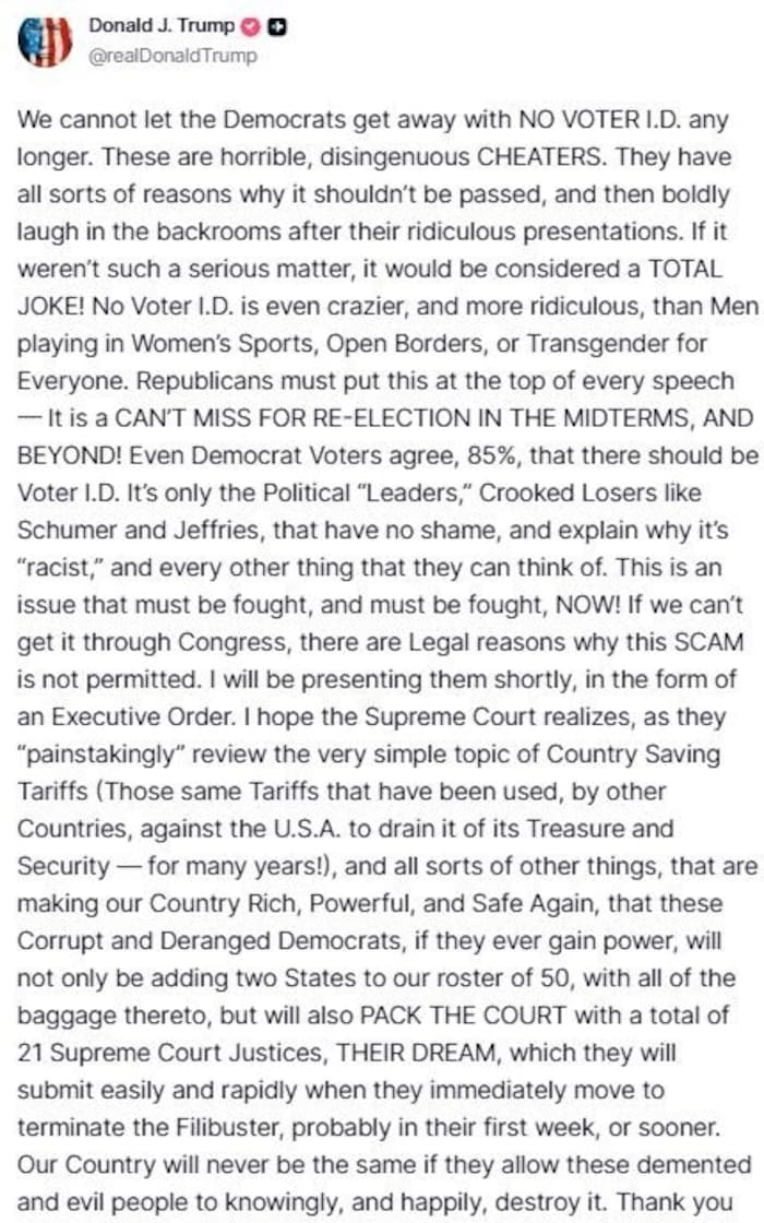 Trump in einem Beitrag (siehe unten) auf Truth Social: „Wir können nicht länger zulassen, dass die Demokraten mit KEINER WÄHLER-ID davonkommen. Diese Leute sind schrecklich, schändliche BETRÜGER. Sie haben alle möglichen Gründe erfunden, warum sie nicht verabschiedet werden sollte und lachen dann dreist hinter verschlossenen Türen (...) Keine Wähler-ID ist sogar noch verrückter und lächerlicher als Männer im Frauensport, offene Grenzen oder Transgender für jedermann (...)“