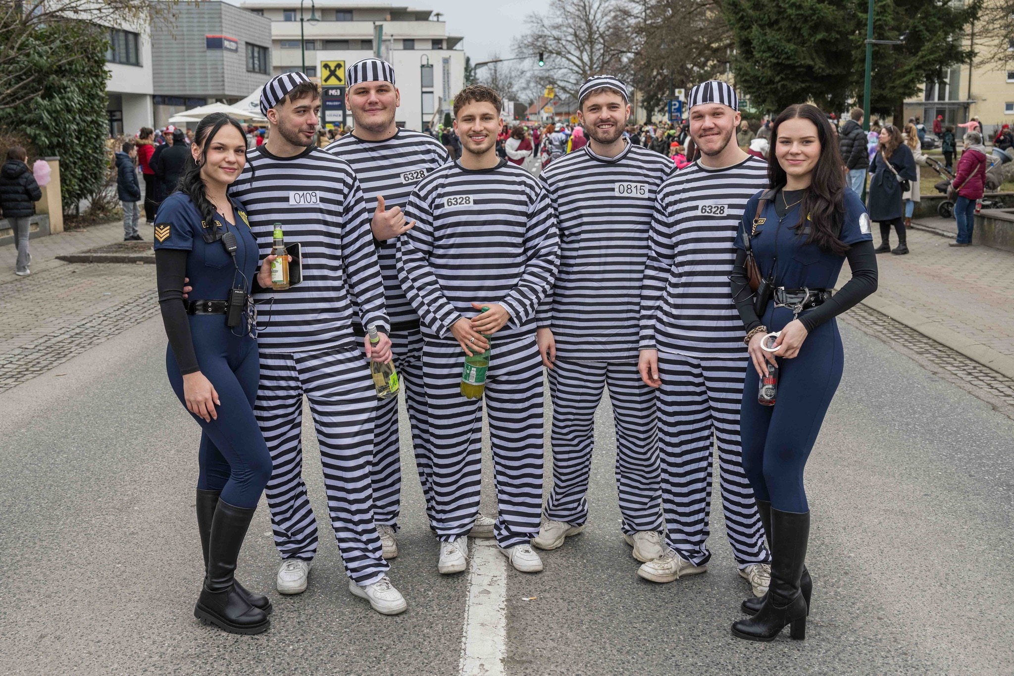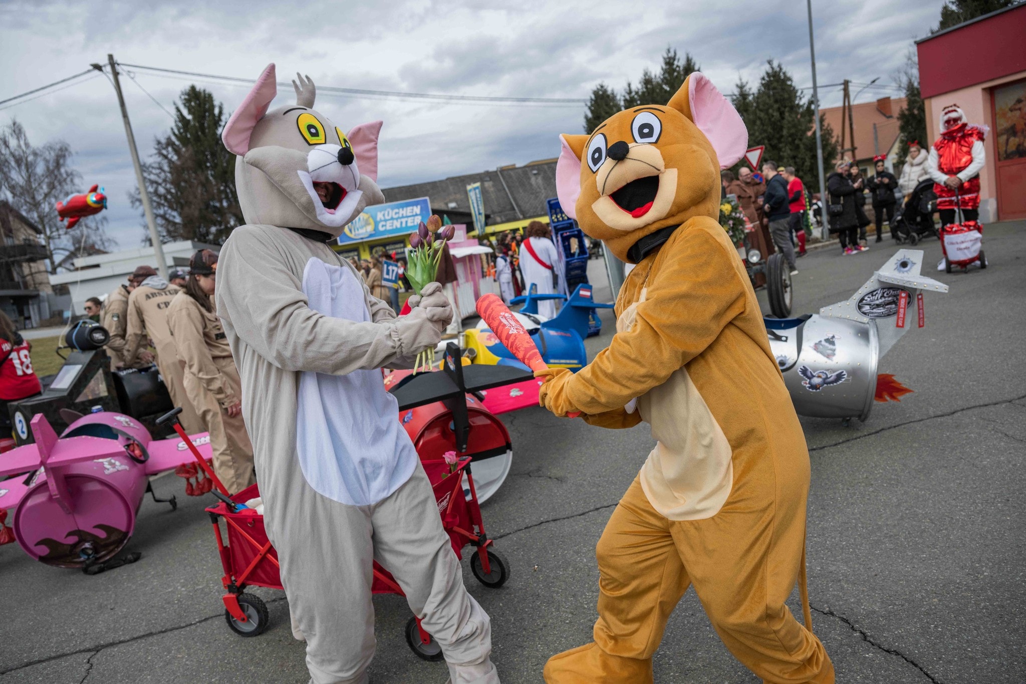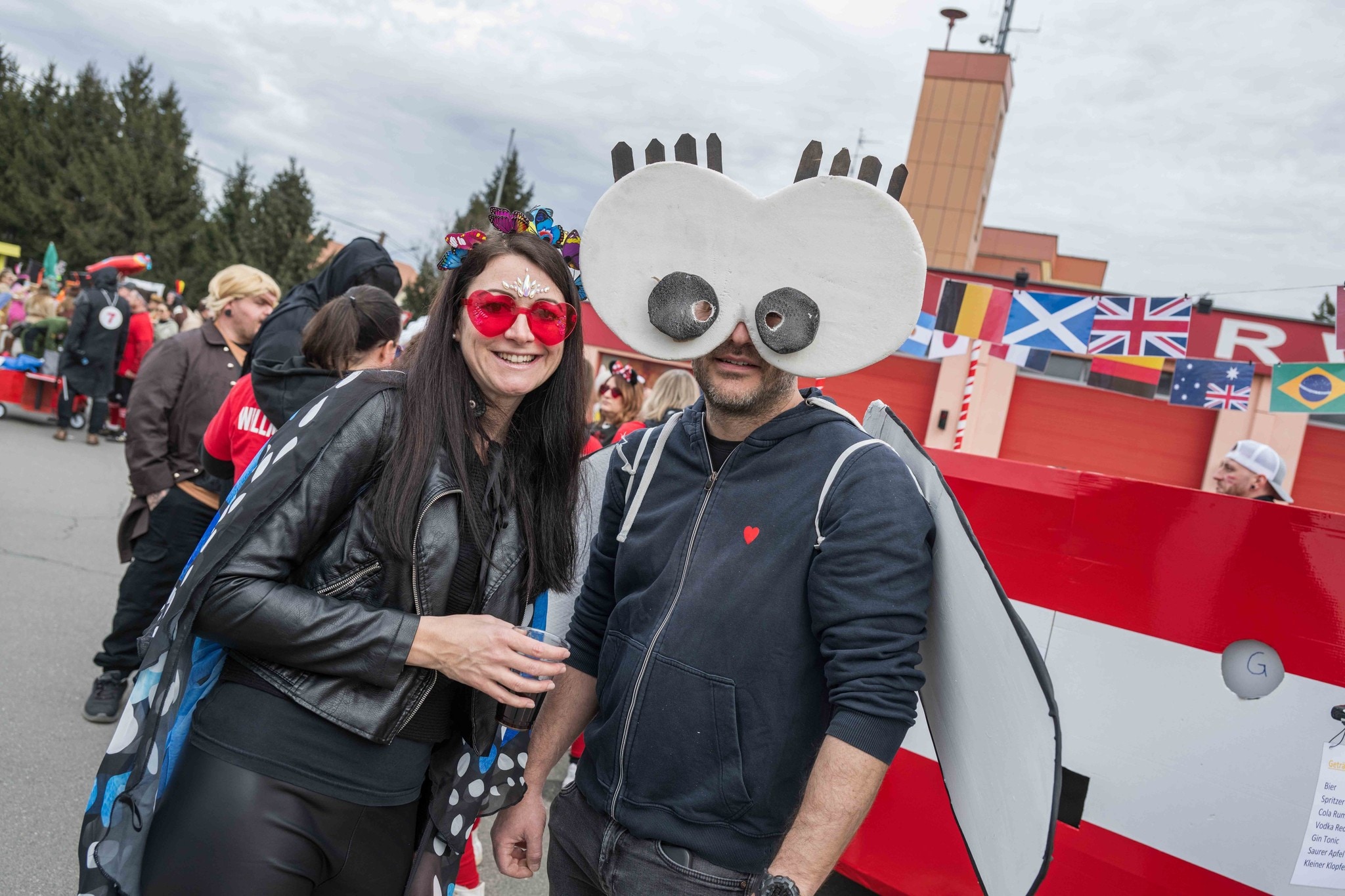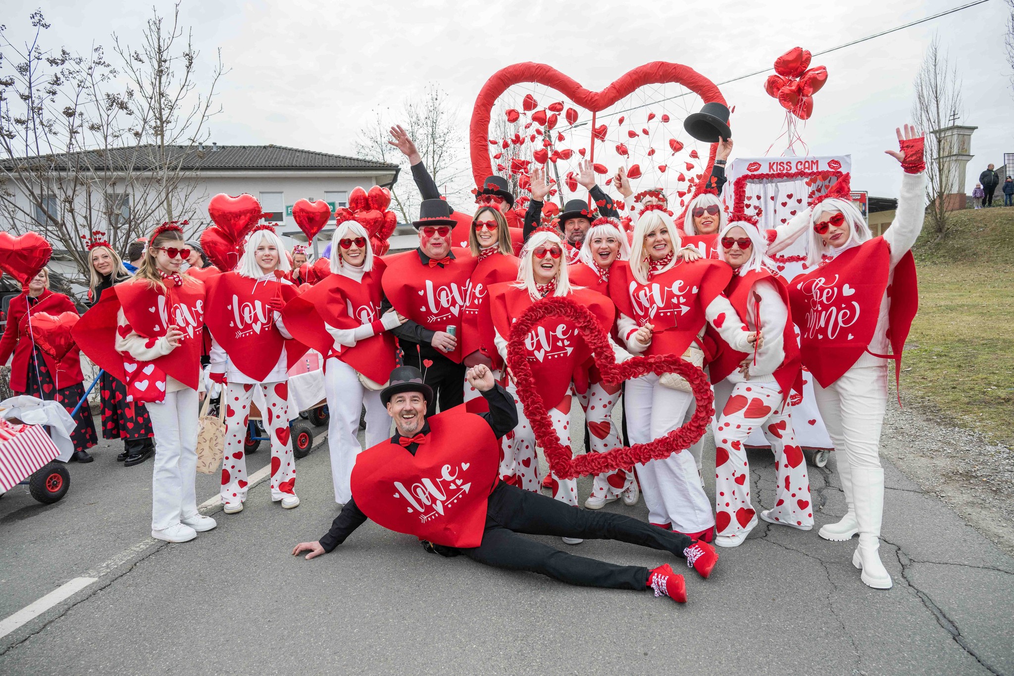 „Happy Valentine“, grölt eine Gruppe aus roten Herzerln – passend zum 14. Februar. In den aufwendigen Kostümen stecken faschingserfahrene Gemeindemitarbeiter: „Wir sind jedes Jahr dabei. Ein bisschen trübt es schon die Stimmung, dass es heuer keine Großwägen gibt.“ Michael und Gernot, die beim Standl Bier ausschenken, geben ihnen recht: „Die Umzugswägen haben immer für die meiste Stimmung gesorgt.“