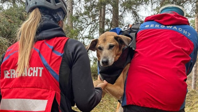 Der bereits 16 Jahre alte Vierbeiner war zusammen mit Frauchen und Herrchen vom Schroffen zum Kugelbachweg unterwegs und saß auf einer Felsstufe fest.