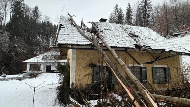 Ein umgefallener Baum hat am Montag in Hallwang in Salzburg nicht nur die Straße blockiert, sondern ist auf das Dach eines Gebäudes gestürzt. Die Feuerwehr musste ausrücken, da die Oberfläche eingedrückt worden war.
