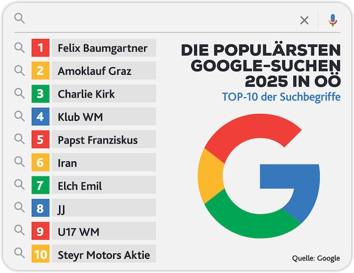 Angeführt wird die Rangliste – siehe Grafik unten – vom im Juli verunglückten Extremsportler „Felix Baumgartner“, gefolgt vom „Amoklauf (in) Graz“ und dem ermordeten rechtspopulistischen Aktivisten „Charlie Kirk“ aus den USA. Doch so weite geografische Kreise zogen die Suchanfragen nicht immer: „Elch Emil“ landet im Vorjahr auf Platz 7 – der Vierbeiner streifte wochenlang durch Oberösterreich. Gerade noch in die Top 10 schaffte es mit der „Steyr Motors Aktie“ das Wertpapier eines heimischen Motorenbauers.