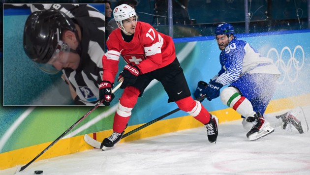 Der Schuss ging gewaltig daneben – und wird bei Tarrington Wyonzek wohl einen tiefblauen Fleck hinterlassen. Beim Eishockey-Play-off-Spiel zwischen der Schweiz und Olympia-Gastgeber Italien hatte sich der Puck - abgefeuert von Jonas Siegenthaler – mit voller Geschwindigkeit seinen Weg zu den Rippen des Linienrichters gebahnt.