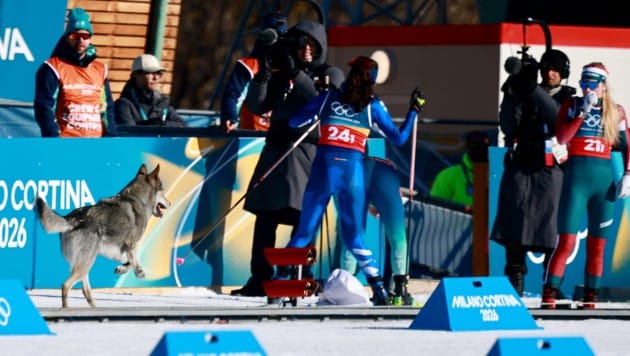 Tierischer Zwischenfall bei Olympia! Während der Teamsprint-Qualifikation der Skilangläuferinnen in Lago di Tesero sorgte plötzlich ein großer, grauer Hund für Verwirrung.