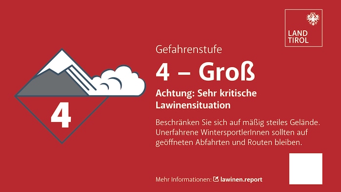 Nach zwei Lawinentoten am Mittwoch warnt auch das Land Tirol und appelliert an alle Alpinisten, auf gesicherten Pisten zu bleiben. Die Lawinengefahrenstufe ist groß, weiterer Neuschnee und Wind verschärfen die Lage zudem enorm.