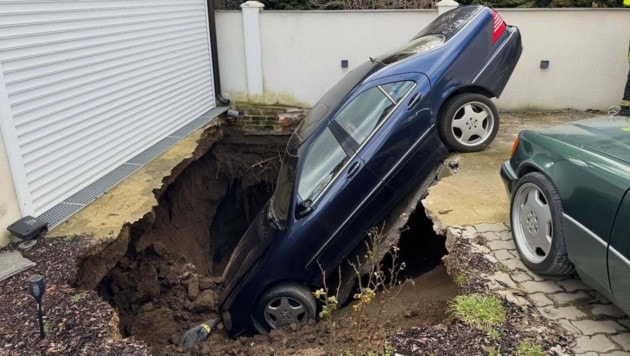 Kurioser und aufwendiger Einsatz für die Feuerwehr in Hollabrunn (Niederösterreich): Weil eine Kellerröhre eingestürzt ist, wurde ein darüber abgestellter Pkw plötzlich „verschluckt“. Die Bergung war äußerst kompliziert.