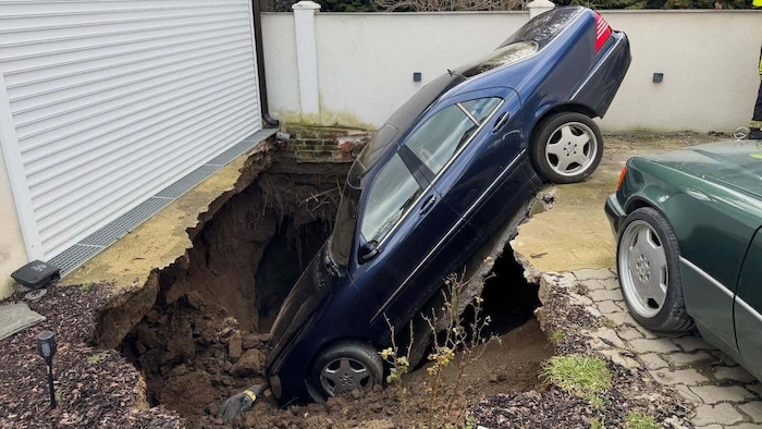 Nur mehr die beiden Hinterreifen des Mercedes hatten noch Kontakt mit der Fahrbahn, der Rest des Fahrzeugs steckte mit der Front nach unten in einem Erdloch. Es war ein äußerst kurioser Anblick, der Dienstagvormittag in der Sitzendorfer Kellergasse in Hollabrunn, eine der größten ihrer Art, zu sehen war.