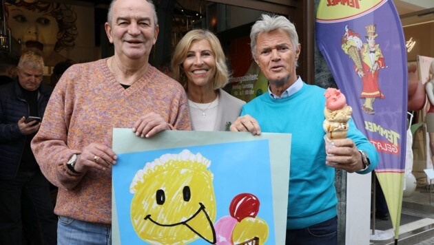 Das „Gemälde“ muss man sich auf der Zunge zergehen lassen – das gelbe, begeistert schleckende „Manderl“ macht ja allein schon gute Laune. „Das ist das erste, was ich jemals gezeichnet hab“, sagte Fußballheld Herbert „Schneckerl“ Prohaska. Und das nach Vorgaben von einem Künstler, der ihm ehrlicherweise auch „ein bissl“ vorgezeichnet hatte. Doch für Freund Charly Temmel macht er das gern – die Sportlegende eröffnete gestern mit dem umtriebigen Eiskönig in Graz die Saison.
