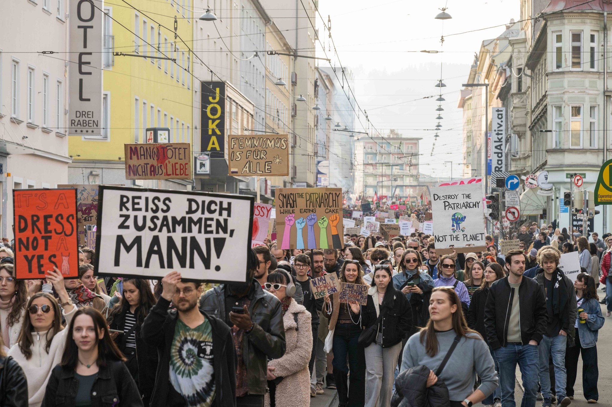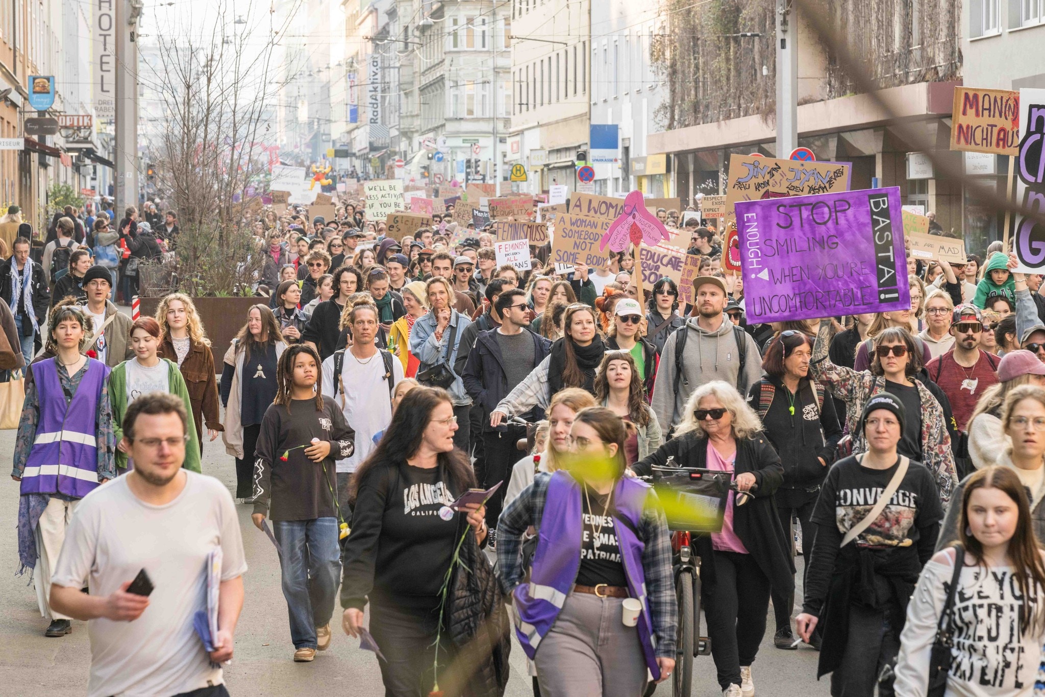 Gegen all diese Ungerechtigkeiten gingen am Samstagnachmittag in Graz Hunderte Frauen auf die Straße. Etwa 4500 Protestierende zogen laut Veranstalter vom Hauptbahnhof über die Annenstraße bis zur Franz-Graf-Allee bei der Oper. „Genug von den schönen Worten und Gleichstellung nur am Papier“, hieß es bei der Anfangskundgebung. „Genug davon, dass Frauen mehr leisten und weniger bekommen. Jeden Tag ist Frauentag!“
