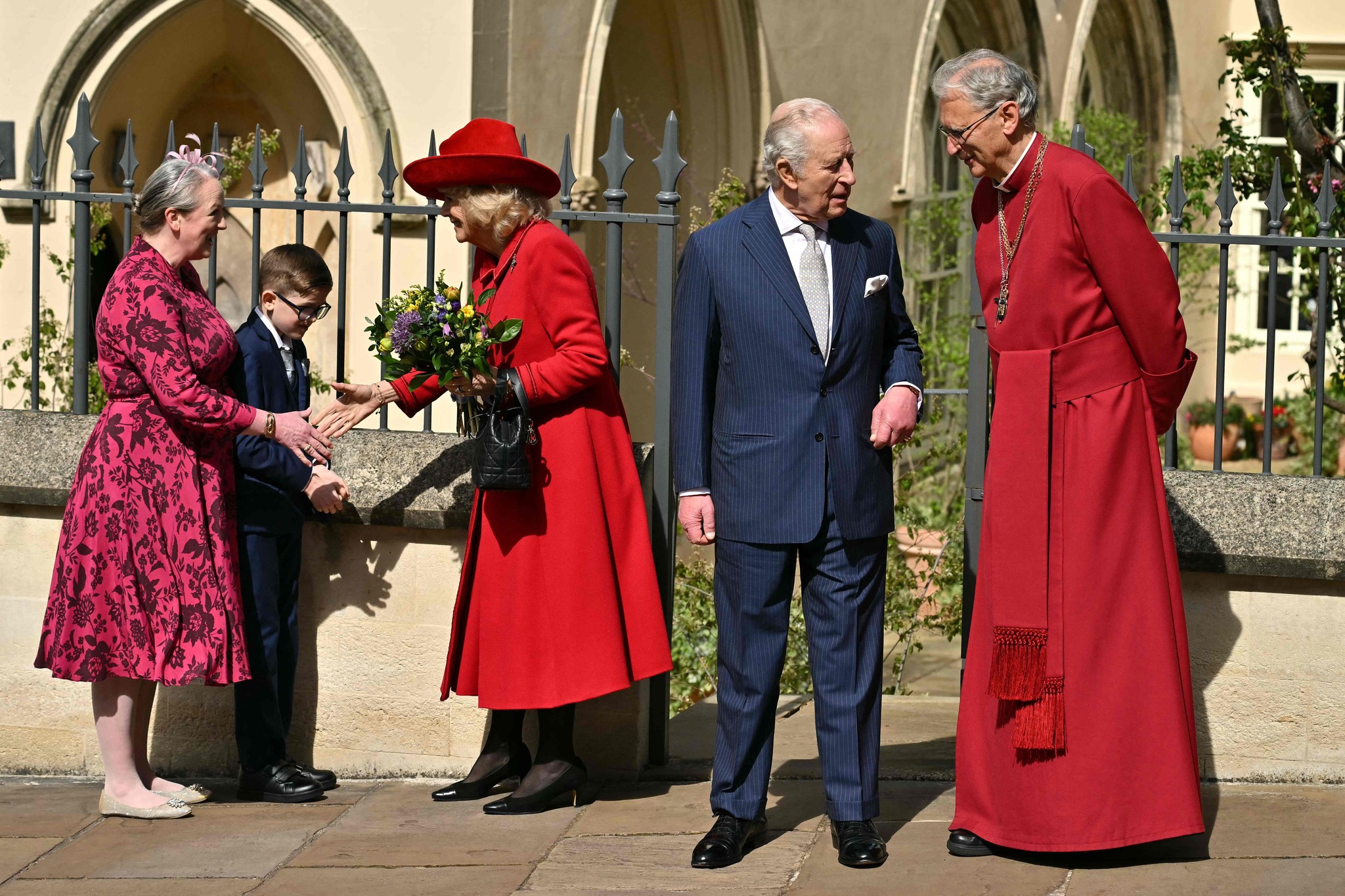 Camilla mit Blumensträußen beschenkt