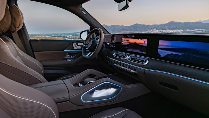 Völlig neu gestaltet wurde das Armaturenbrett mit dem über die komplette Fahrzeugbreite reichenden Superscreen. Unter dieser Glasfläche finden sich drei je 12,3 Zoll große Displays – also immer auch eines für den Menschen auf dem rechten Vordersitz. In den Tiefen des GLS werkelt ein mit KI unterfütterter Supercomputer als lernender und sich ständig weiterentwickelnder Helfer für alle Lebenslagen. Über die Intelligent Cloud von Mercedes lässt sich die Software auf den neuesten Stand bringen. Dank der KI, unter anderem aus dem Hause Microsoft, kann das gesammelte Wissen aus dem Internet abgerufen werden - und zwar in Form von komplexen, mehrteiligen Dialogen.
