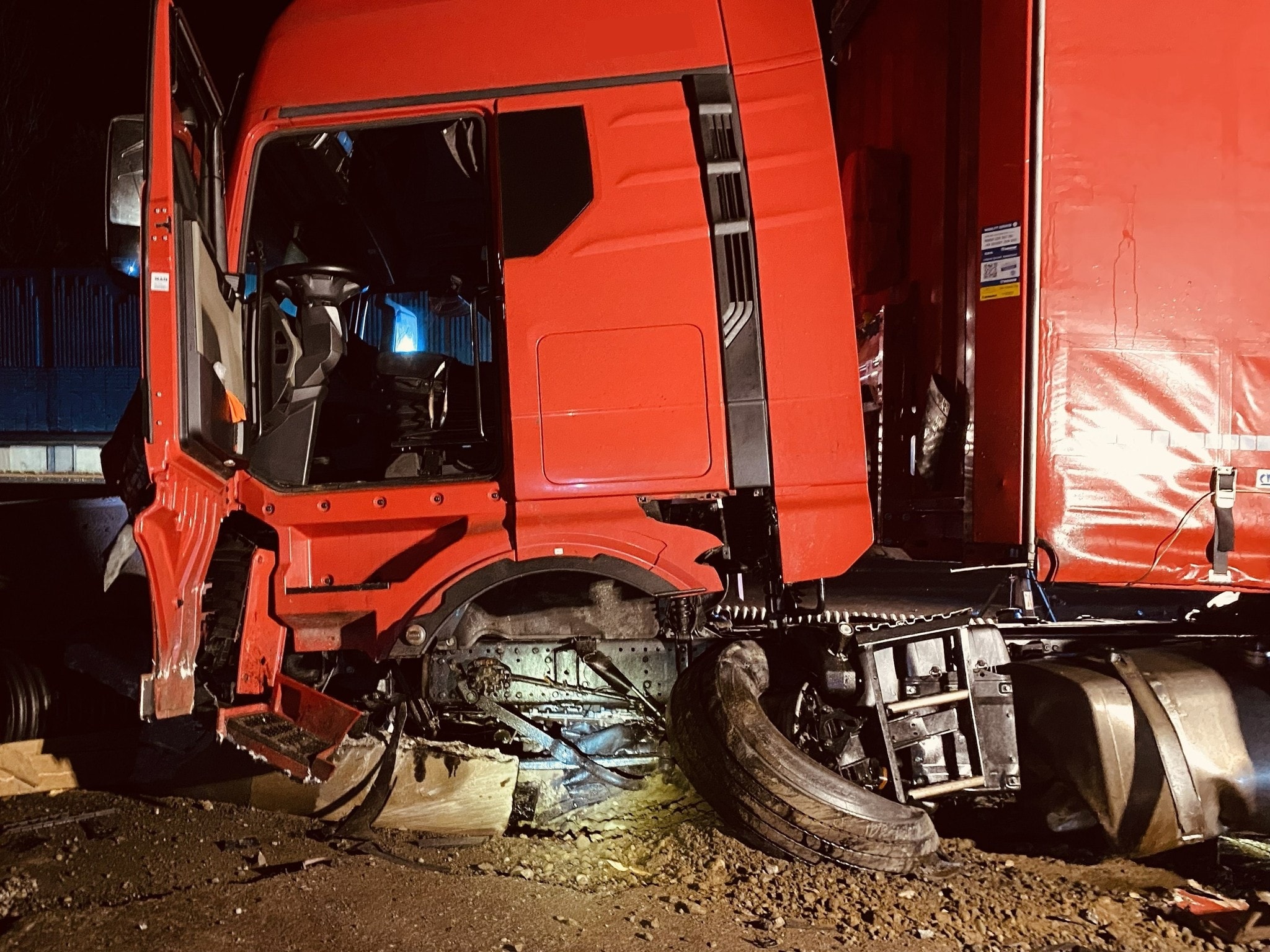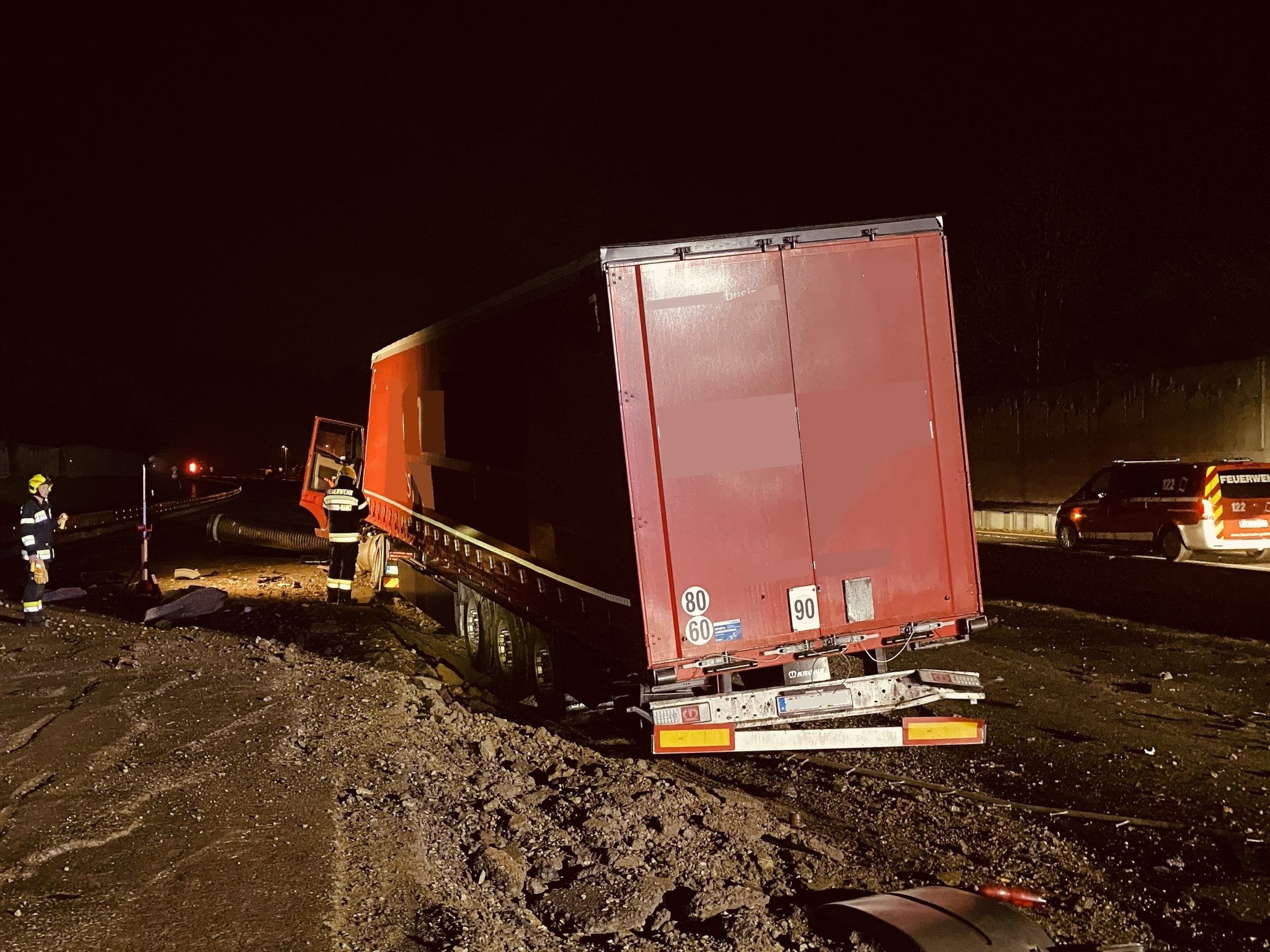 An der Sattelzugmaschine entstand erheblicher Sachschaden, auch ein nachkommender Lkw wurde beschädigt. Die Fahrzeuge mussten von einem Abschleppunternehmen geborgen werden. Die Mittelleitschiene wurde auf einer Länge von über 100 Metern massiv beschädigt.