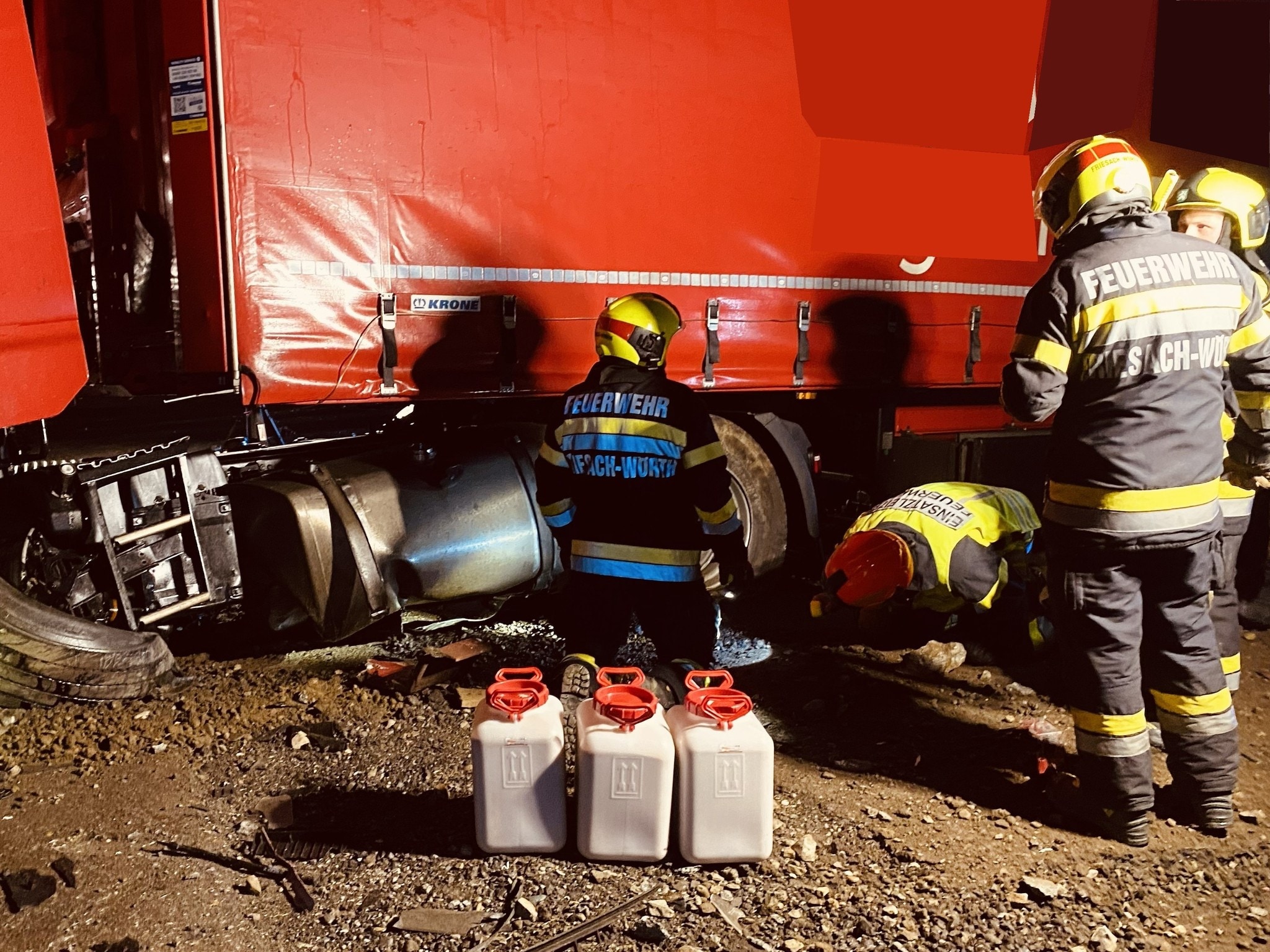 Durch den Aufprall wurden der Dieseltank sowie die Ölwanne in Mitleidenschaft gezogen, wodurch es zu einem Austritt von Diesel und Öl kam. Die ausgelaufenen Betriebsflüssigkeiten gelangten in den Mittelstreifen sowie in den aufgefrästen Asphaltbereich der Autobahn. Die Freiwilligen Feuerwehren Gratkorn, Frohnleiten und Friesach konnten die noch im Fahrzeug befindlichen Betriebsflüssigkeiten sichern und in einen externen Tank umpumpen.