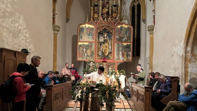 Bei der ersten heiligen Messe am Magdalensberg standen die Kreuze prominent im Kirchenraum: Mit ihnen führen Kreuzträger Gruppen an, die über die vier Berge wandern, dabei neuen Leuten begegnen und auch sich selbst neu kennenlernen, denn die gut 52 Kilometer sind eine Herausforderung. An einer Labestation kurz vor dem Ulrichsberg stärkte sich auch Elena Überbacher: „Auf dem Weg trifft man so einige Leute, auch Sänger, die ab und zu ein Ständchen anstimmen. Den Kreuzträgern folgen Menschen, die Rosenkranz beten.“