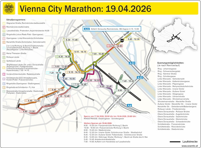 Besonders hart trifft es den Bereich rund um den Ring: Zwischen Operngasse und Stadiongasse gelten Sperren von 5.45 Uhr bis fast 20 Uhr. Auch der Abschnitt beim Burgtheater, wo sich das Ziel befindet, bleibt bis in den Abend hinein blockiert.