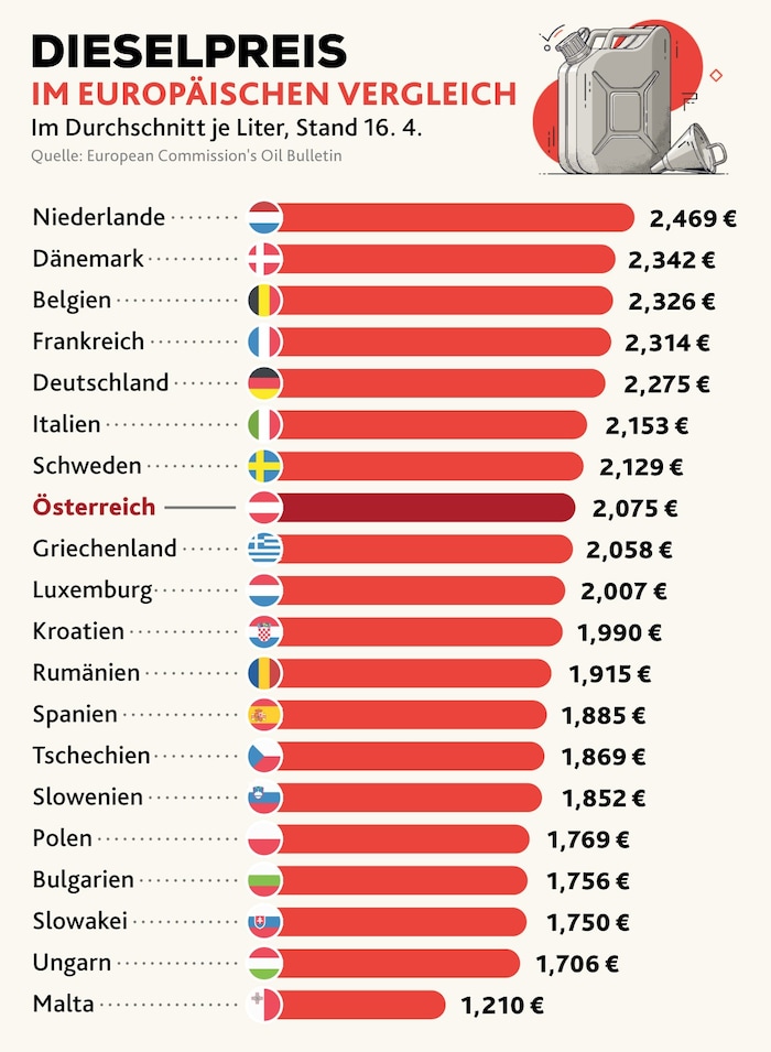 Even though fuel prices have fallen slightly in Austria recently, a country-by-country comparison shows that Austria ranks in the upper middle range in Europe for diesel. In many neighboring countries, commuters and business owners pay significantly less. With regard to supply security, Economy Minister Wolfgang Hattmannsdorfer is trying to reassure the public.