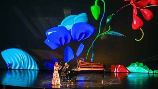 Noch bevor die beiden Künstler das Podium betraten, leuchtete auf der Bühnenrückwand eine Projektion auf, die den ganzen Abend bleiben sollte. Es war ein Bild aus der Serie „Blumen aus Plastik“ der aus Bregenz stammenden Medienkünstlerin Claudia Larcher. Dieses faszinierende Werk soll eine „Verbindung von darstellender und bildender Kunst sichtbar“ machen. Perfekt wäre es gewesen, wenn das Kleid von Lisa Batiashvili darauf abgestimmt gewesen wäre, denn das farbstarke Bild Larchers hat die zart-duftige Robe der Geigerin förmlich erschlagen. Vielleicht wollte man mit dieser Projektion von dem Vorwurf ablenken, dass das Bregenzer Festspielhaus zu groß sei für Kammermusik.